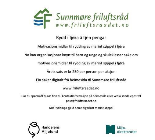 No kan organisasjonar knytt til barn og unge og skuleklassar søke om motivasjonsmidlar til rydding av marint søppel i fjøra. Årets sats er kr 250 per person per aksjon.